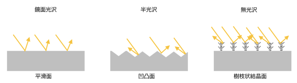 表面の状態が、凹凸になれば表面上の散乱が増え、鏡面よりも弱い光沢度になります。
