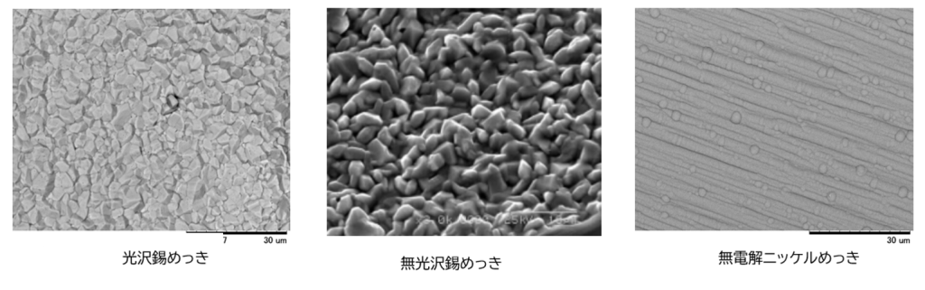 素材の粗さの影響がないとして、光沢度は、めっき液に加えられる添加剤や処理条件によって結晶粒子の析出状態がことなることで変化させています。