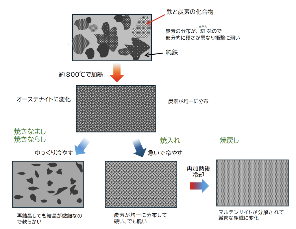 また、「焼入れ」は、オーステナイト化した金属組織を、急に冷ますとマルテンサイトという金属組織に変化して、均一に炭素が分布した硬い金属になります。