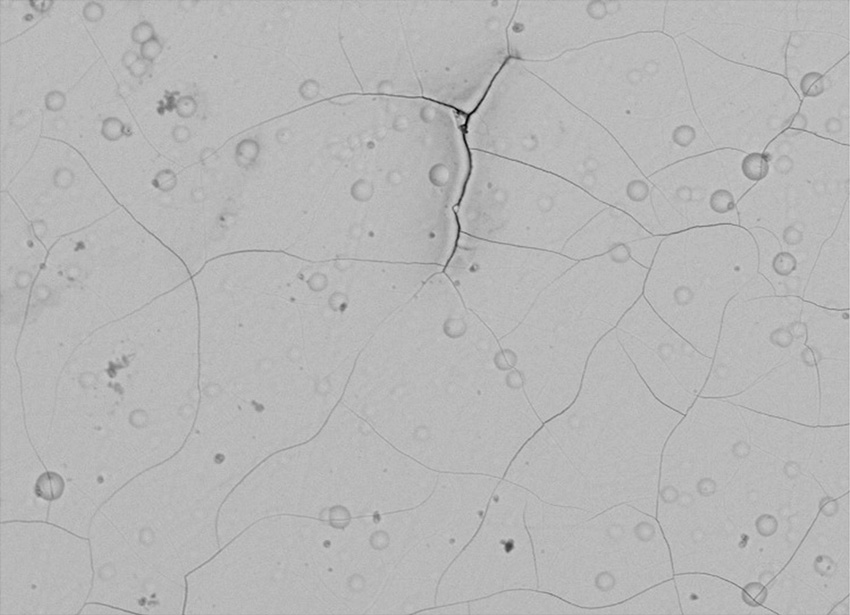 めっきの厚さは、装飾めっきでは0.1~0.5μmほどですが、薄い場合はピンホールが多くなり、また、厚い場合は、クラック(ひび割れ)が生じてしまいます。